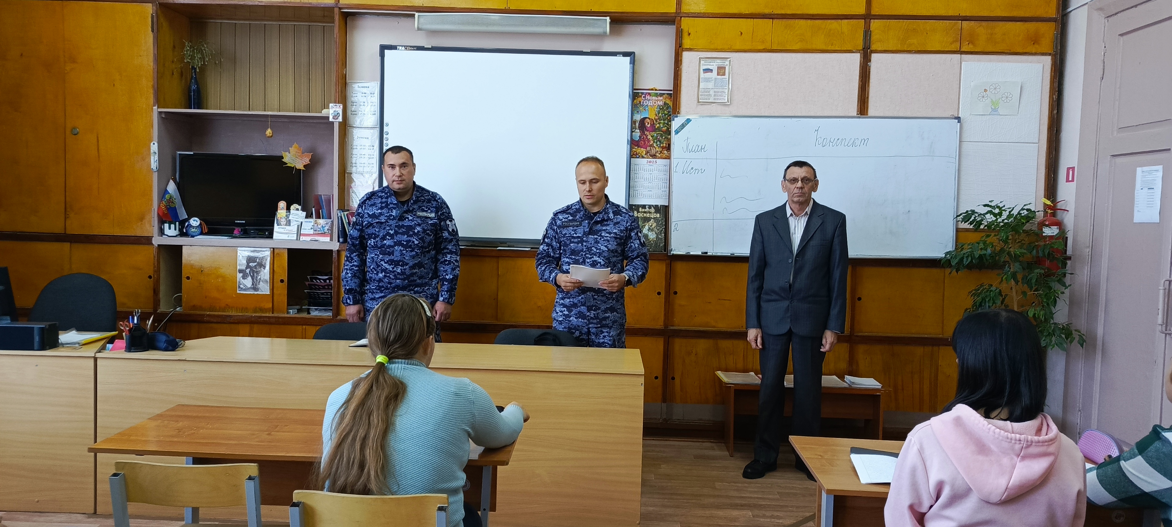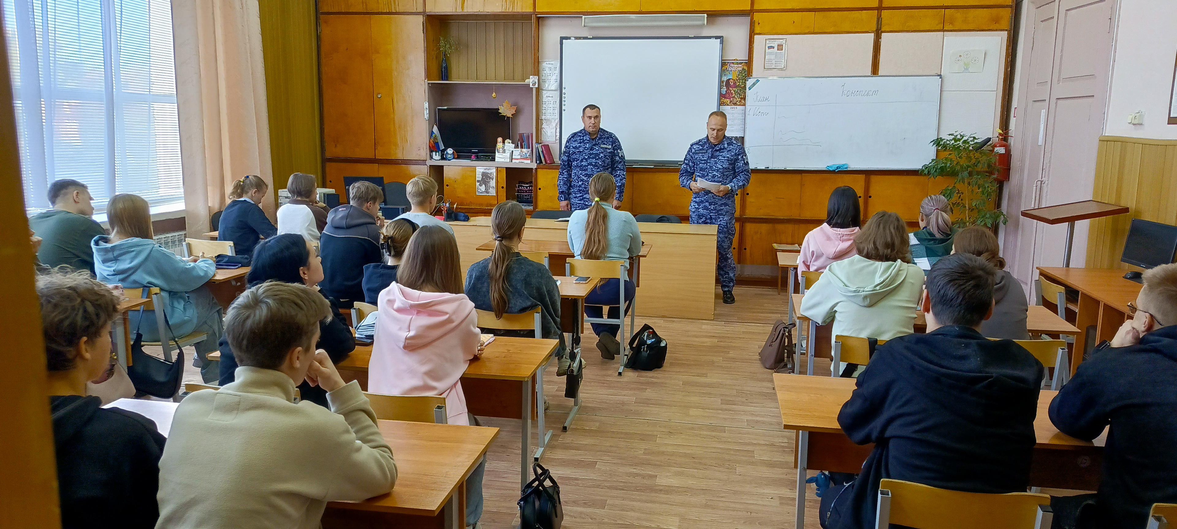 Открытый урок проводили заместитель директора по комплексной безопасности Кузнецов В.В., сотрудники Вичугского МОВО — филиала ФГКУ «УВО ВНГ России по Ивановской области» Фролов В.С. и Крупин Д.В. На уроке присутствовали обучающиеся первого курса в количестве 38 человек. Были рассмотрены вопросы по порядку действий при получении сигнала оповещения «ВНИМАНИЕ ВСЕМ» (с доведением информации о ракетной, авиационной и беспилотной опасности).