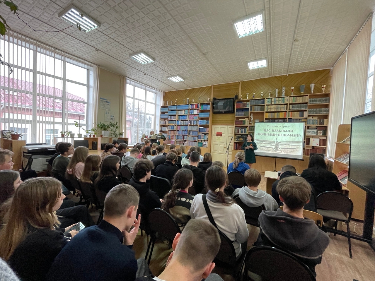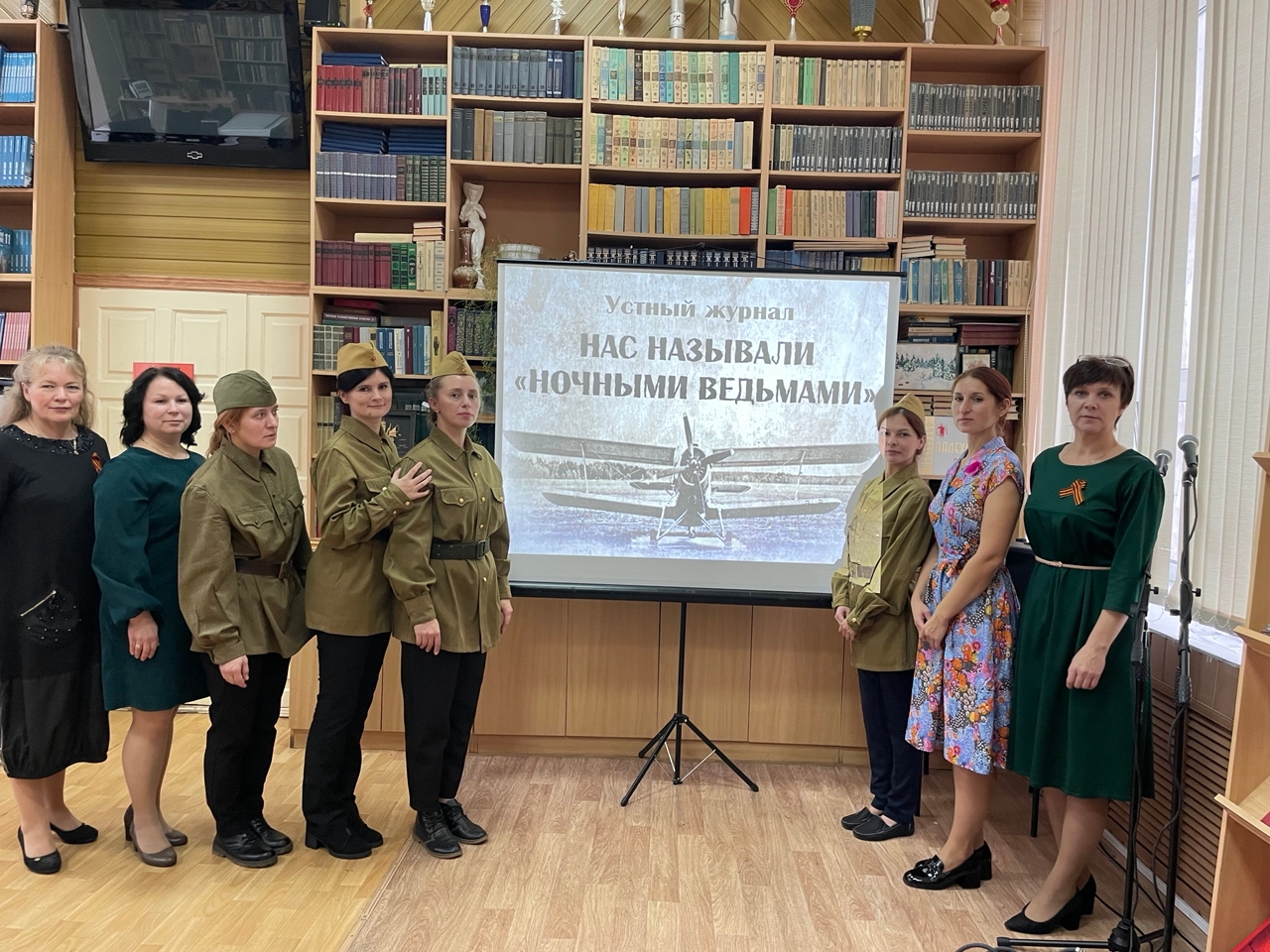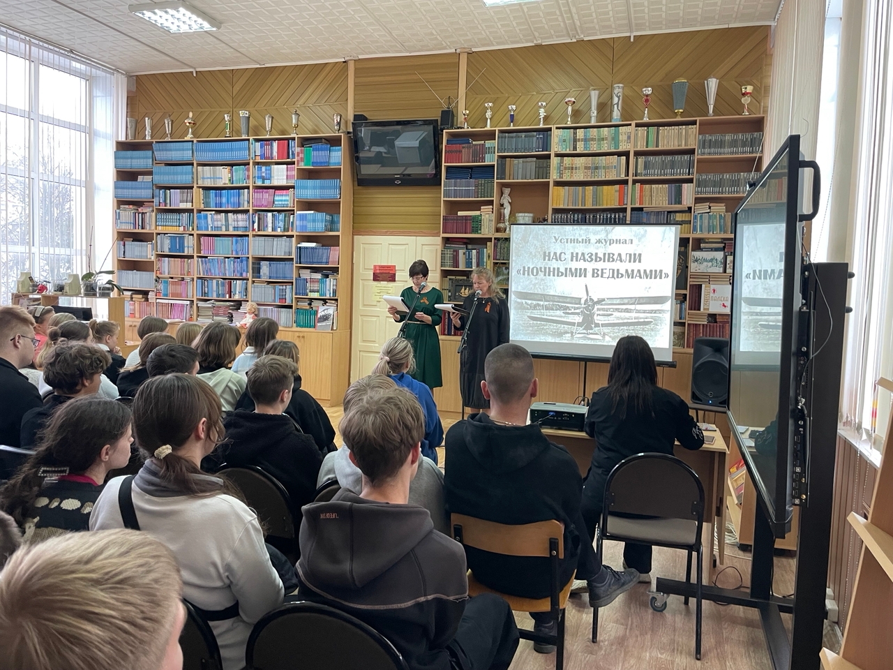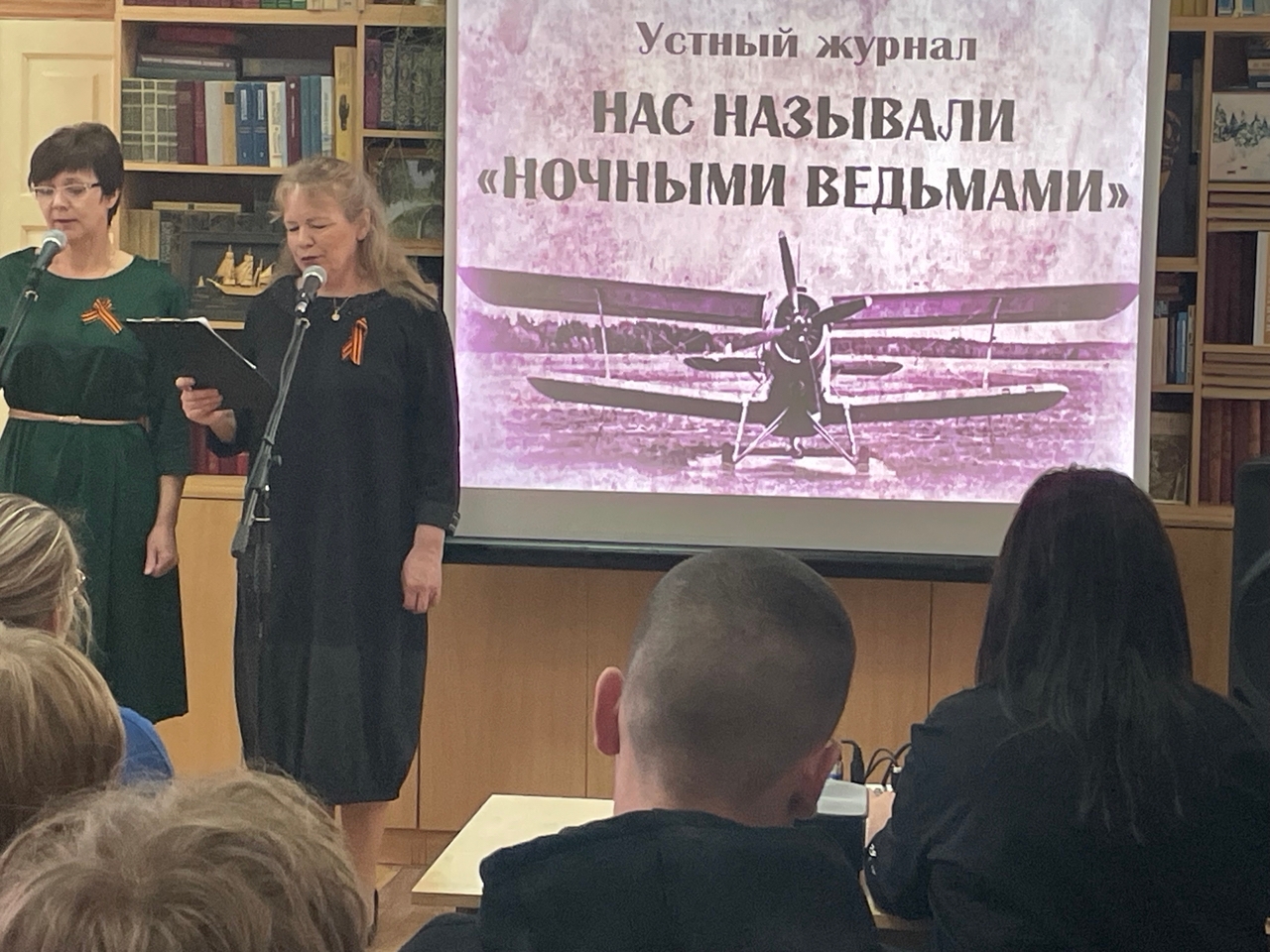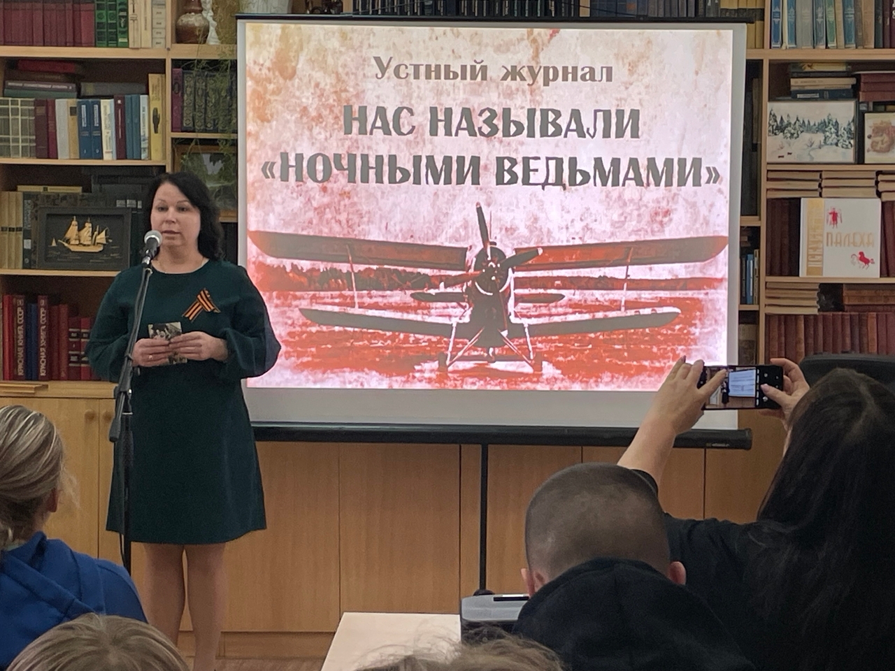 Под таким названием вошли в историю девушки — ночные бомбардировщицы из 46-го Гвардейского Таманского авиационного полка. «Ночными ведьмами» их в годы Великой Отечественной войны окрестили немцы. Полк был и остаётся единственным в мире полком, полностью укомплектованном женщинами, причём абсолютное большинство из них были добровольцами. Девушки-лётчицы смогли превратить свои самолёты в грозное оружие, которое наводило ужас на фашистов. Библиотекари рассказали обучающимся историю создания и боевого пути полка, о судьбах некоторых лётчиц, вошедших в историю своими героическими подвигами.