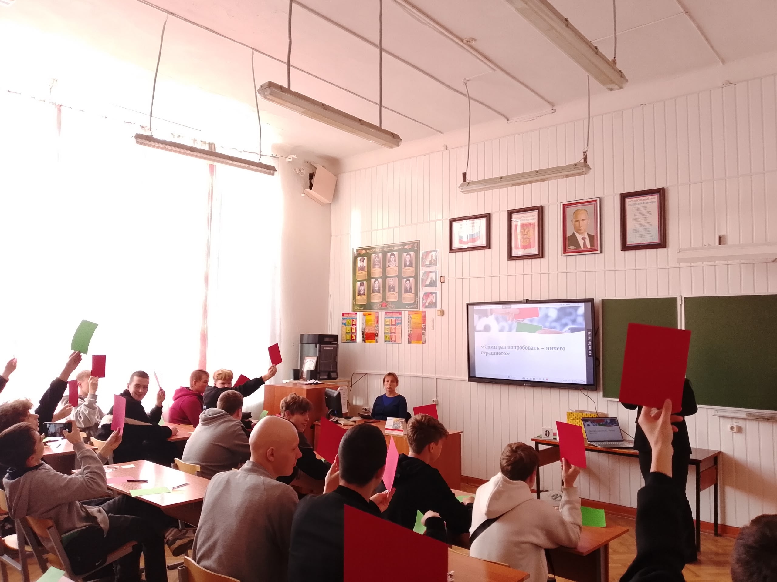 Ребята рассмотрели вопросы о том, почему подростки употребляют ПАВ, как ПАВ влияет на человека, просмотрели социальный видеоролик. В завершении занятия студенты предлагали различные варианты уверенного отказа от предложения попробовать ПАВ, как сказать «НЕТ!», как снизить страх перед отказом сверстникам, как помочь другим постараться выбраться из зависимости.
