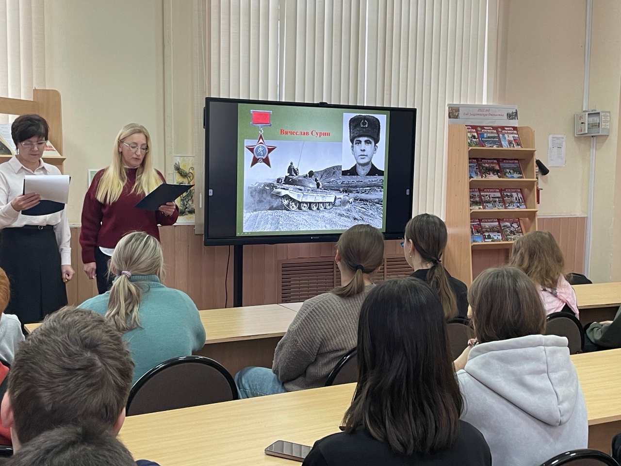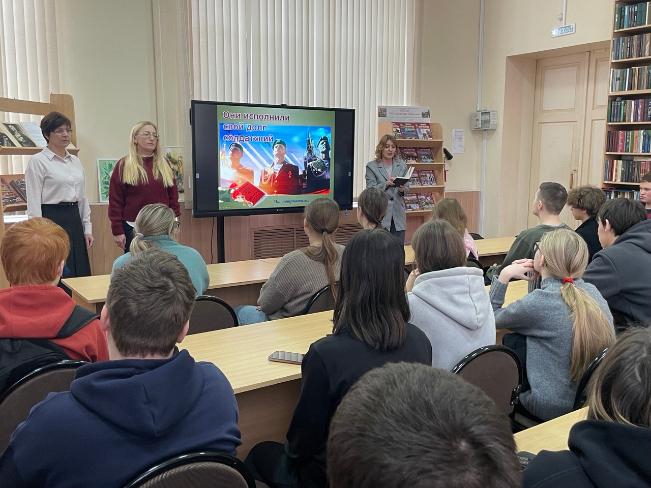 В преддверии Дня героев Отечества, в День неизвестного солдата в Родниковском политехническом колледже со студентами первого и второго курса состоялось заседание клуба «Перекрёсток» — час патриотизма «Они исполнили свой долг солдатский». Библиотекари Публичной библиотеки познакомили ребят с историей возникновения праздника, рассказали о героях современной России — родниковцах, которые воевали в «горячих точках» и с достоинством защищали нашу Родину.