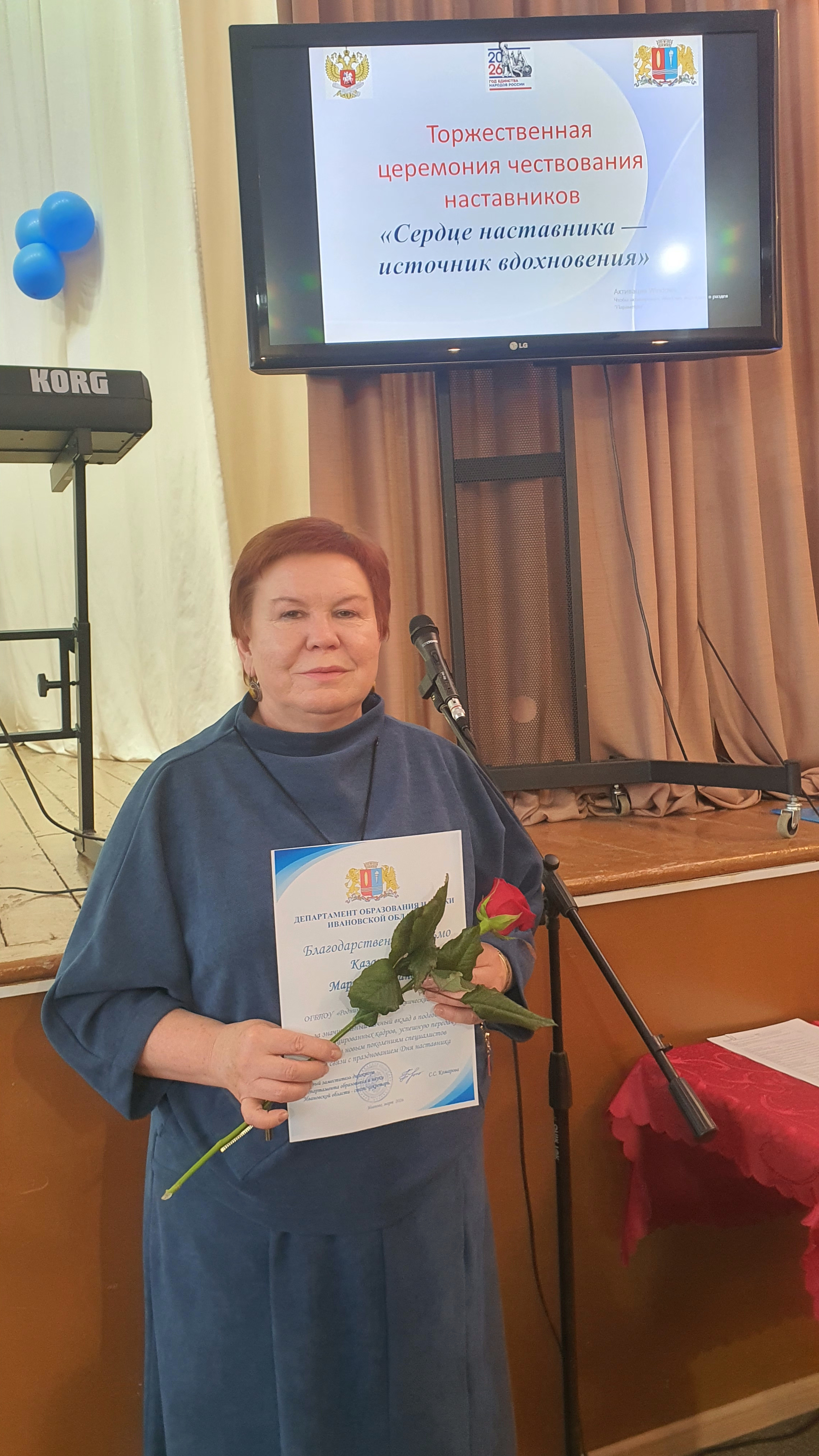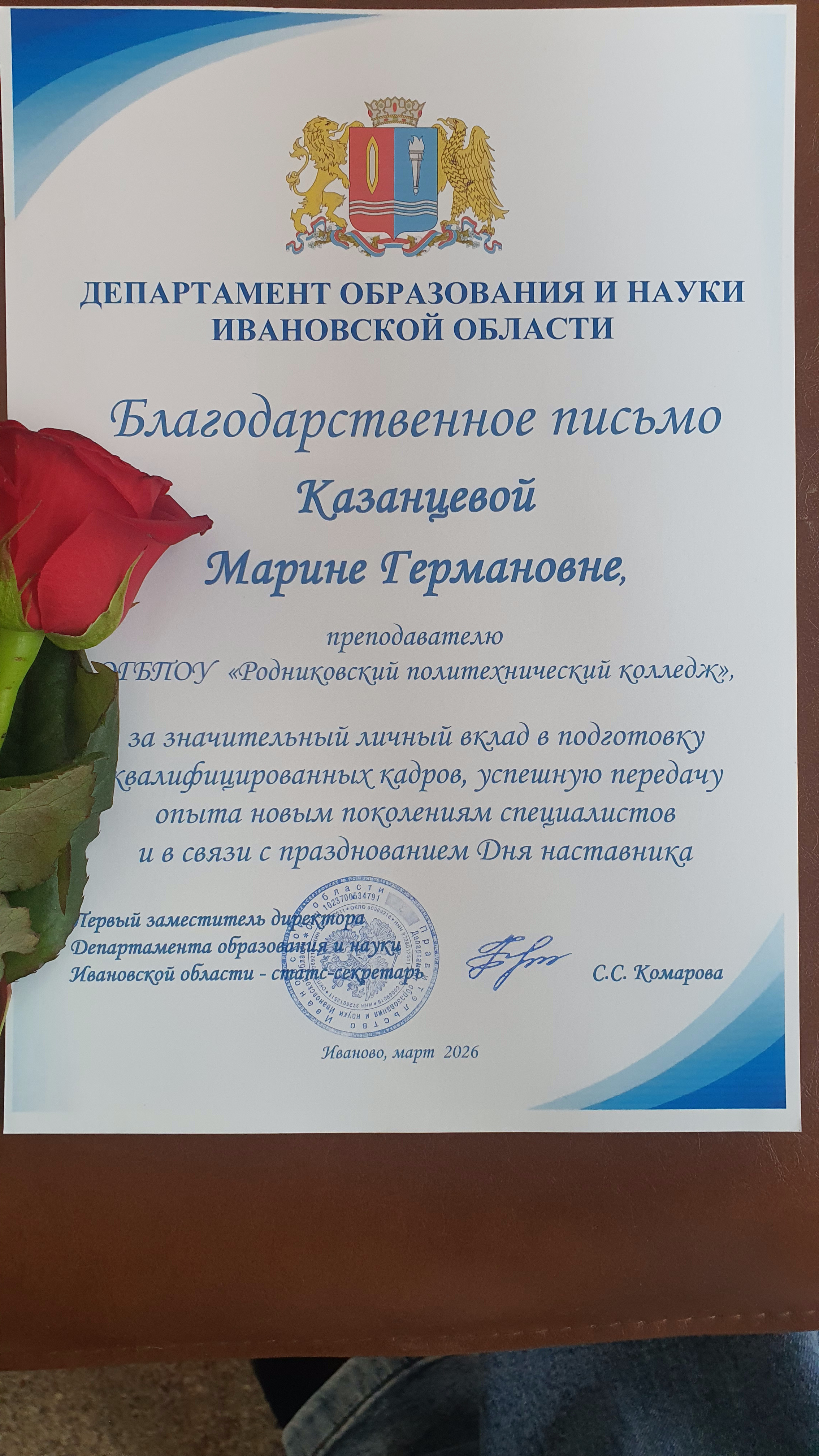 В этот же день в ОГБПОУ ИКСУ состоялась Торжественная церемония чествования наставников «Сердце наставников – источник вдохновения». Среди лучших наставников системы СПО Ивановской области — и наш преподаватель Казанцева Марина Германовна. Ей вручено Благодарственное письмо Департамента образования и науки Ивановской области за значительный личный вклад в подготовку квалифицированных кадров и успешную передачу опыта новым поколениям специалистов.